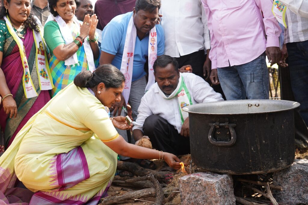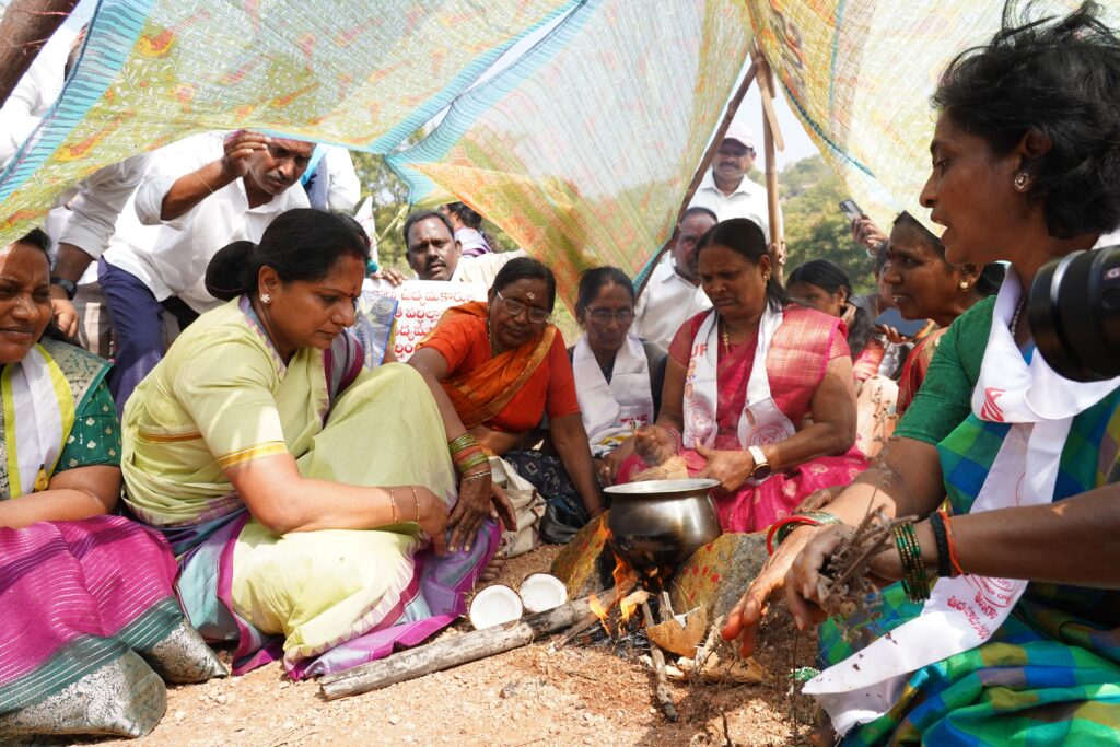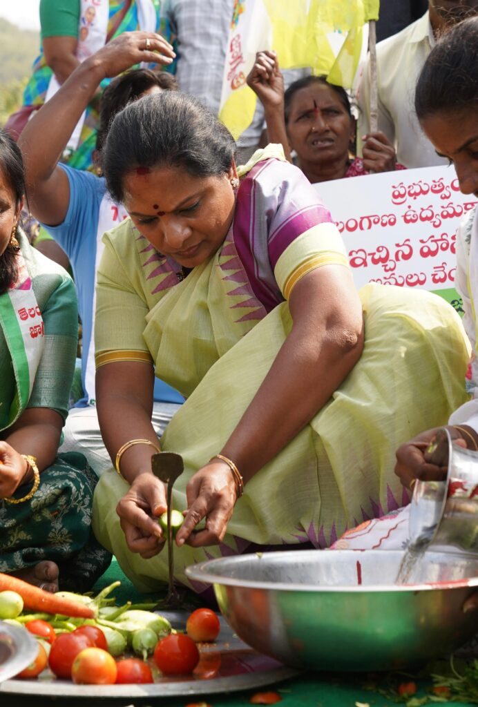 మానకొండూరులో భూ పోరాటం చేసి నిర్మించిన గుడిసెలో తెలంగాణ జాగృతి అధ్యక్షురాలు కల్వకుంట్ల కవిత పాలు పొంగించారు. తెలంగాణ ఉద్యమకారులకు కాంగ్రెస్ సర్కార్ ఇచ్చిన హామీని నెరవేర్చాలని డిమాండ్ చేస్తూ తెలంగాణ ఉద్యమకారులతో కలిసి వంటావార్పు నిర్వహించారు. స్వయంగా కూరగాయలు తరిగి వంట చేశారు. ఈ సందర్భంగా వేసిన గుడిసెలో ఆమె పాలు పొంగించారు.. ఉద్యమకారుల ఇంటి నిర్మాణానికి భూమి పూజ చేశారు. ఈ సందర్భంగా మీడియాతో కల్వకుంట్ల కవిత మాట్లాడుతూ కాంగ్రెస్ ప్రభుత్వం ఉద్యమకారులకు 250 గజాల జాగ ఇస్తామన్న విషయాన్ని గుర్తు చేసేలా పోరాడుతున్నామన్నారు. మీరు ప్రామిస్ చేసినట్లుగా రూ. 25 వేల పెన్షన్, గుర్తింపు కార్డులు, సంక్షేమ బోర్డు ఏర్పాటు చేయాలని డిమాండ్ చేశారు. ప్రతి జిల్లాలో ఉద్యమకారులు వివిధ ఫోరమ్ లలో ఉద్యమం మొదలు పెట్టారని తెలిపారు.